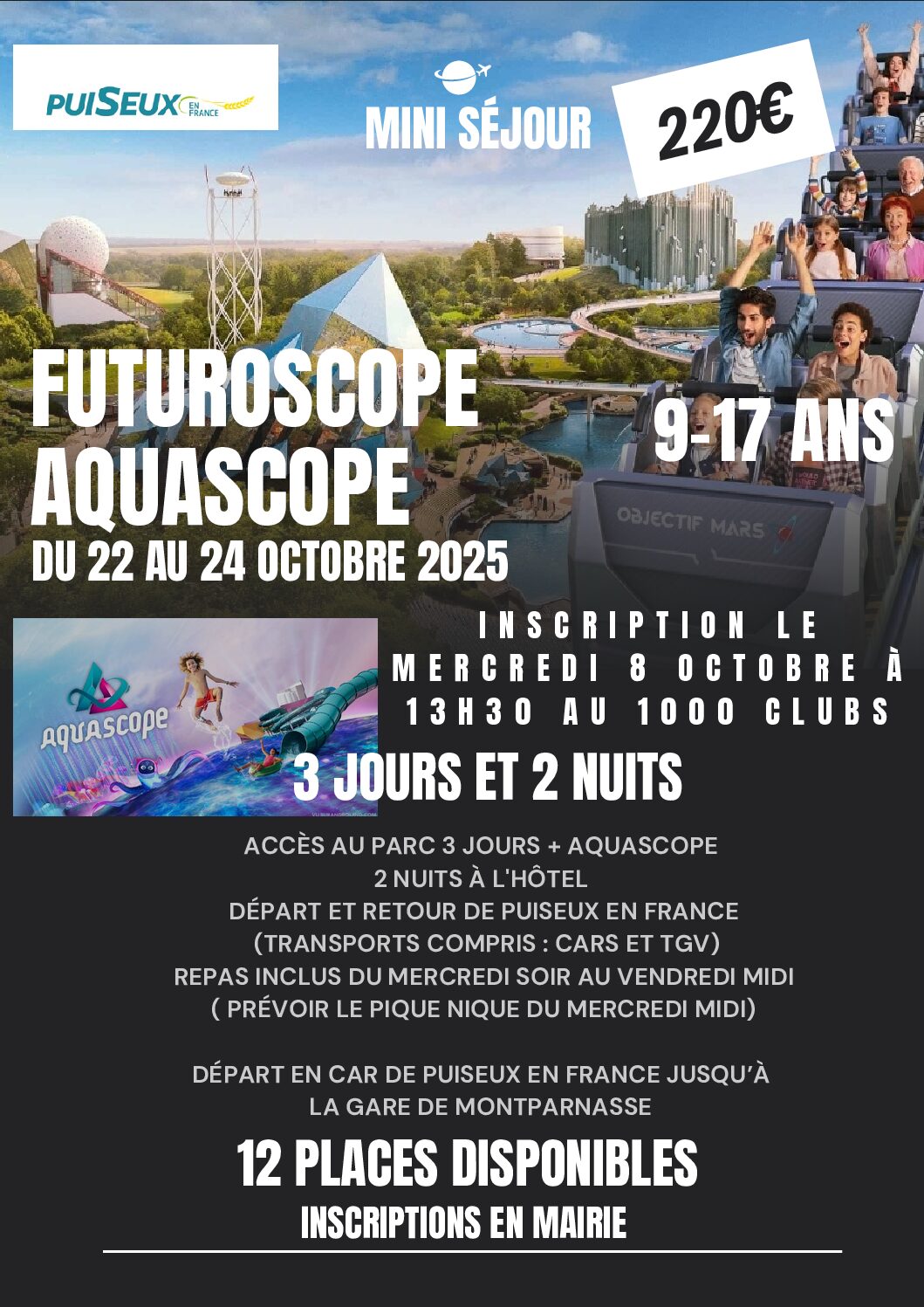 La commune de Puiseux en France organise un séjour au Futuroscope du 22 octobre au 24 octobre 2025 dans le cadre de l’espace ado OXY’Jeune.