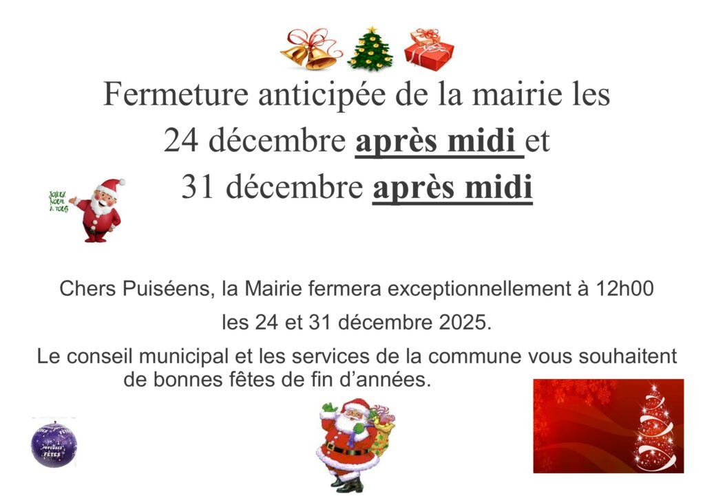 • Fermetures exceptionnelles de la mairie et de l’agence postale les après midi des 24 et 31 décembre 2025