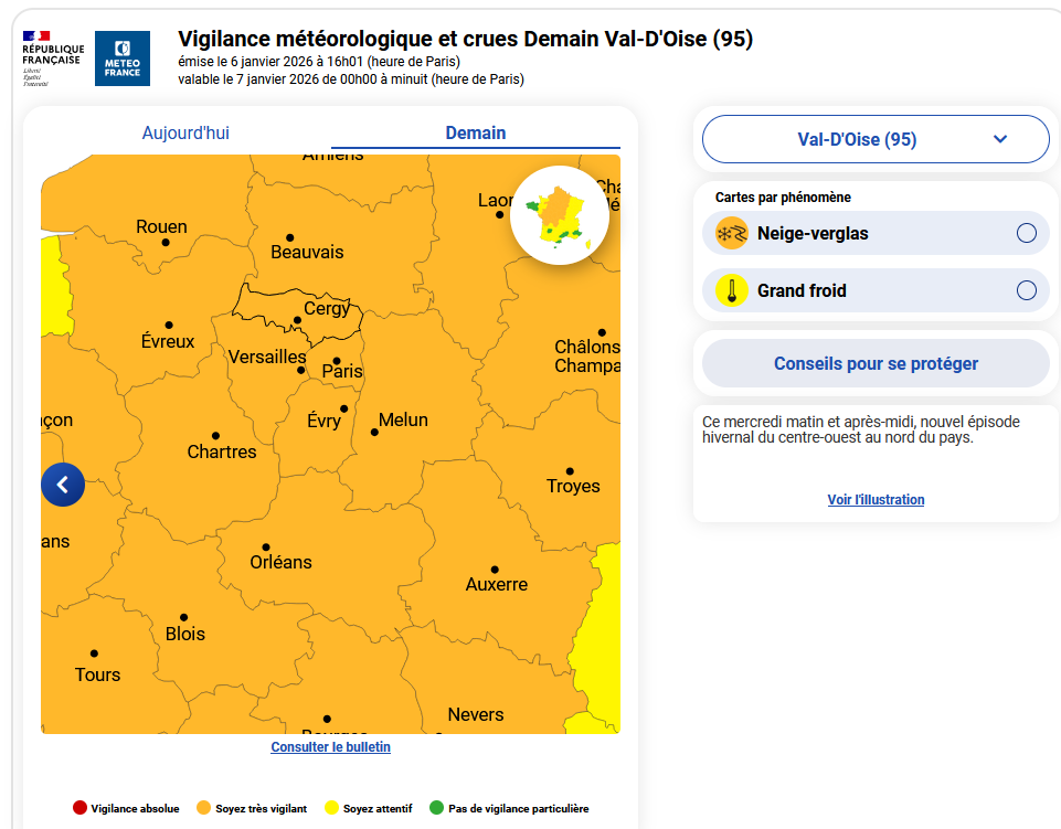 Merci de faire preuve de prudence dans vos déplacements. Le département du Val-d’Oise sera de nouveau placé en vigilance orange pour le phénomène neige-verglas ce mercredi matin à partir de 6h00 jusqu’à 14h00.