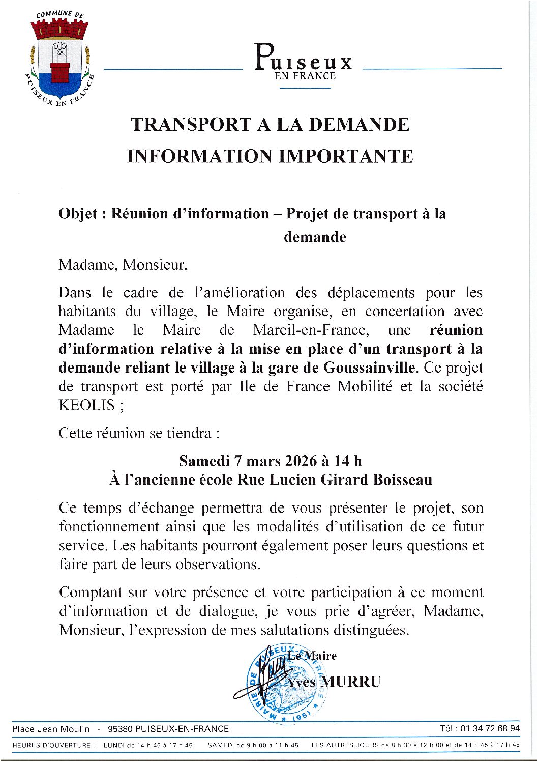 Dans le cadre de l’amélioration des déplacements pour les habitants du village, le Maire organise, en concertation avec Madame le Maire de Mareil-en-France, une réunion d’information relative à la mise en place d’un transport à la demande reliant le village à la gare de Goussainville. Ce projet de transport est porté par Ile de France Mobilité et la société KEOLIS ;
